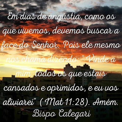 Em dias de angústia, como estes que vivemos, devemos buscar a face do Senhor. Pois ele mesmo nos chama dizendo: "Vinde a mim, todos os que estais cansados e oprimidos, e eu vos aliviarei" (Mat 11:28). Pela Bíblia, nós de antemão sabemos serem estes dias, um tempo de adormecimento da Igreja; pois as vírgens (figura da Igreja) "tardando o esposo, tosquenejaram todas, e adormeceram" (Mat 25:5). Porém, este adormecimento não deve ser causa de nossa preocupação; pois o que define nosso preparo, para irmos ao encontro de Jesus, são as orações que mantém nossa reserva de azeite em nível aceitável. Amém. Aleluia. Vem Senhor Jesus!